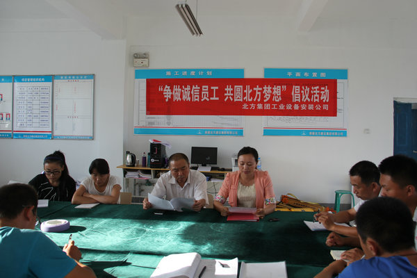 (通訊員 邵小晶)為加強全體員工的思想道德教育,踐行社會(huì )主義核心價(jià)值觀(guān),8月18日,北方建設集團工業(yè)設備安裝公司在天北新區項目部開(kāi)展了“爭做誠信員工,共圓北方夢(mèng)想”主題倡議活動(dòng)。