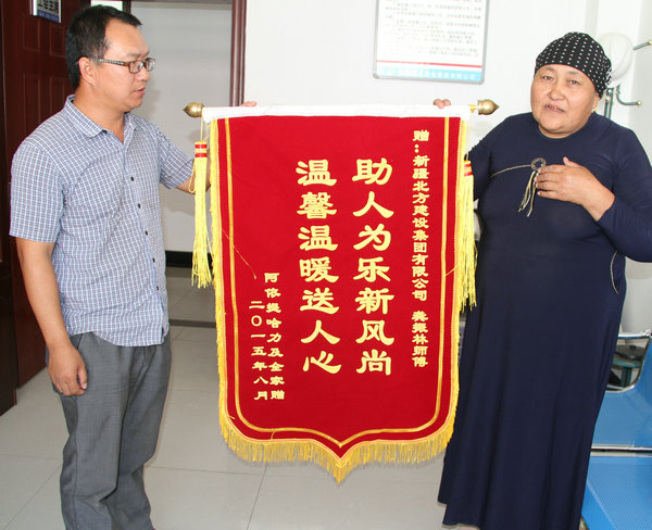 2015年4月北方集團獨山子分公司“消防水池”項目開(kāi)工建設,巧的是項目工地正好在她家附近施工。在施工過(guò)程中,當時(shí)的項目經(jīng)理龔振林看到虎娃諾爾一家生活困難,圈牛和羊棚舍幾乎要坍塌,水電也不暢通,家里沒(méi)能力修繕,了解這些情況后,龔振林就組織項目人員,幫助她們修繕了快要坍塌的牛、羊圈,解決了水電等問(wèn)題。項目工程結束了,但哈薩克族大媽卻對這件事念念不忘,制作了錦旗走了十幾公里的路程來(lái)到北方集團獨山子分公司尋找龔振林,表示她的感激之情。