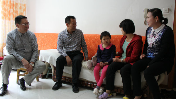 崔副政委在師殘聯(lián)理事長(cháng)馬春明、北方建設集團工會(huì )主席李桂萍的陪同下來(lái)到殘疾孩子家中,在聽(tīng)取李主席對殘疾兒童王佳悅的簡(jiǎn)單介紹后,崔副政委和馬理事長(cháng)都與孩子家中親切交談,仔細詢(xún)問(wèn)孩子的身體和康復狀況,并說(shuō):“中秋馬上就要到了,七師殘聯(lián)和北方公司黨委始終都關(guān)注著(zhù)你們,祝愿你們身體健康,生活愉快!”同時(shí)送上1000元慰問(wèn)金,把師黨委及公司黨委的溫暖融化在一言一行中。